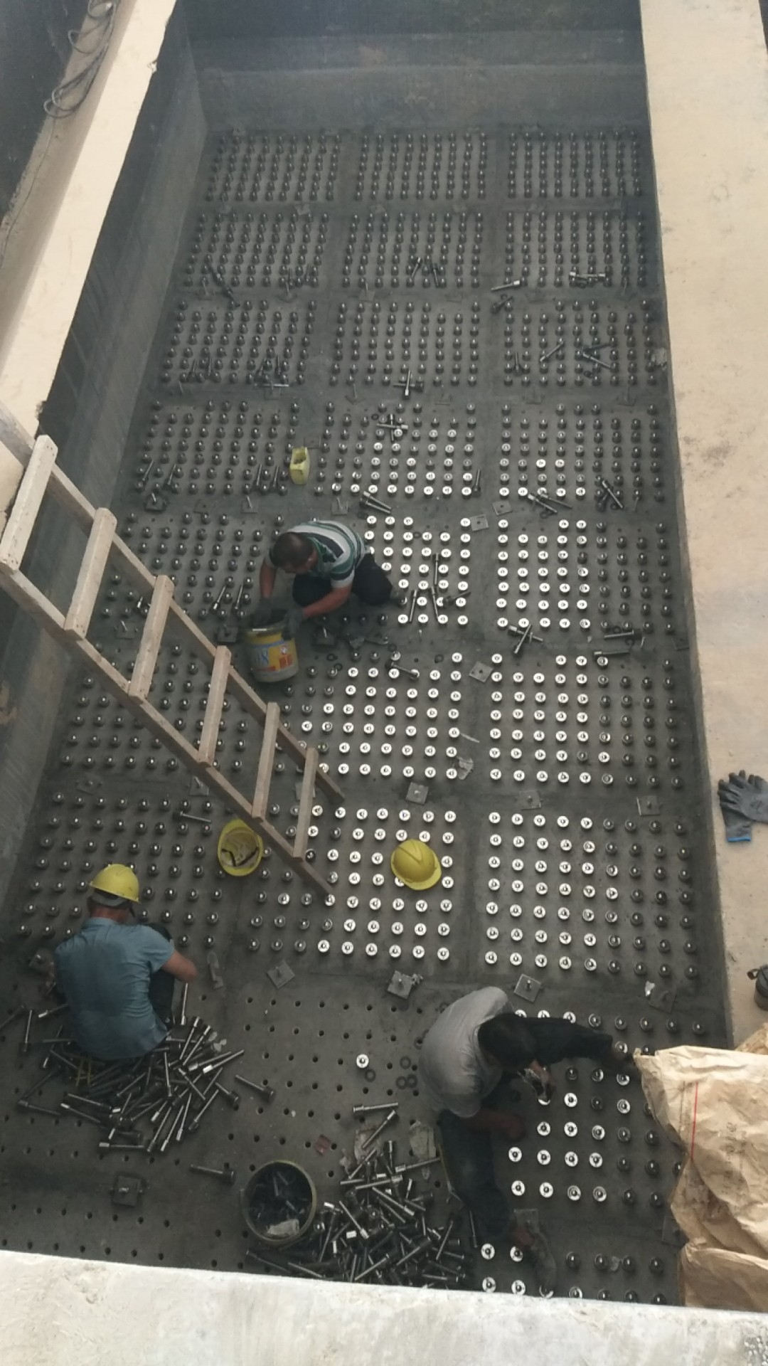 濾板水平安裝精度要求較高,其重要基礎(chǔ)是涉及濾梁的整池平整及預(yù)埋鉚固濾板用的不銹鋼件定位準(zhǔn)確性,因此,濾梁找平要求水平線,必須要有配置高標(biāo)準(zhǔn)的金屬模具和熟練的制造技術(shù),才能確保濾梁的平整度,平面找平后,再安裝濾板。